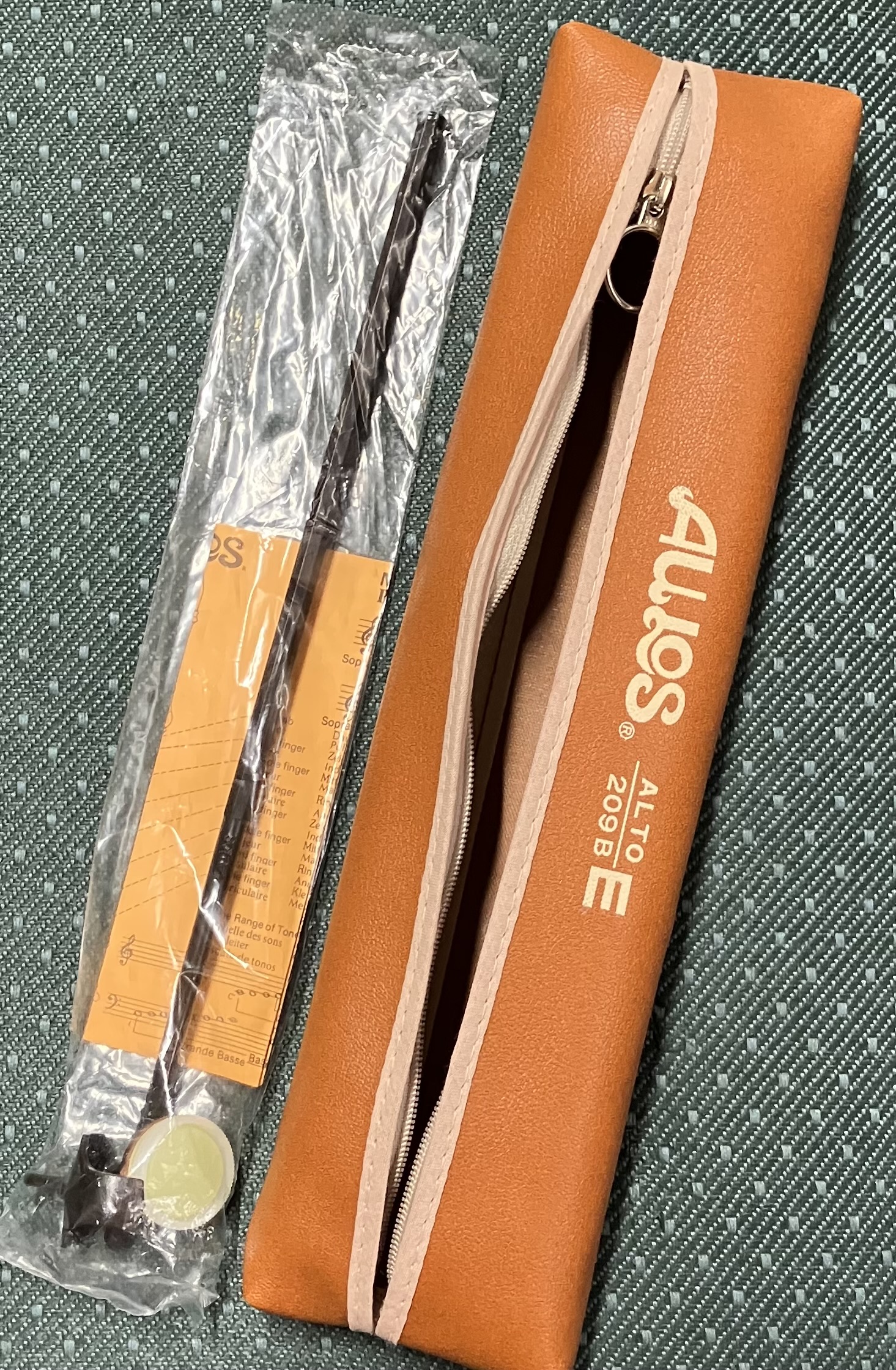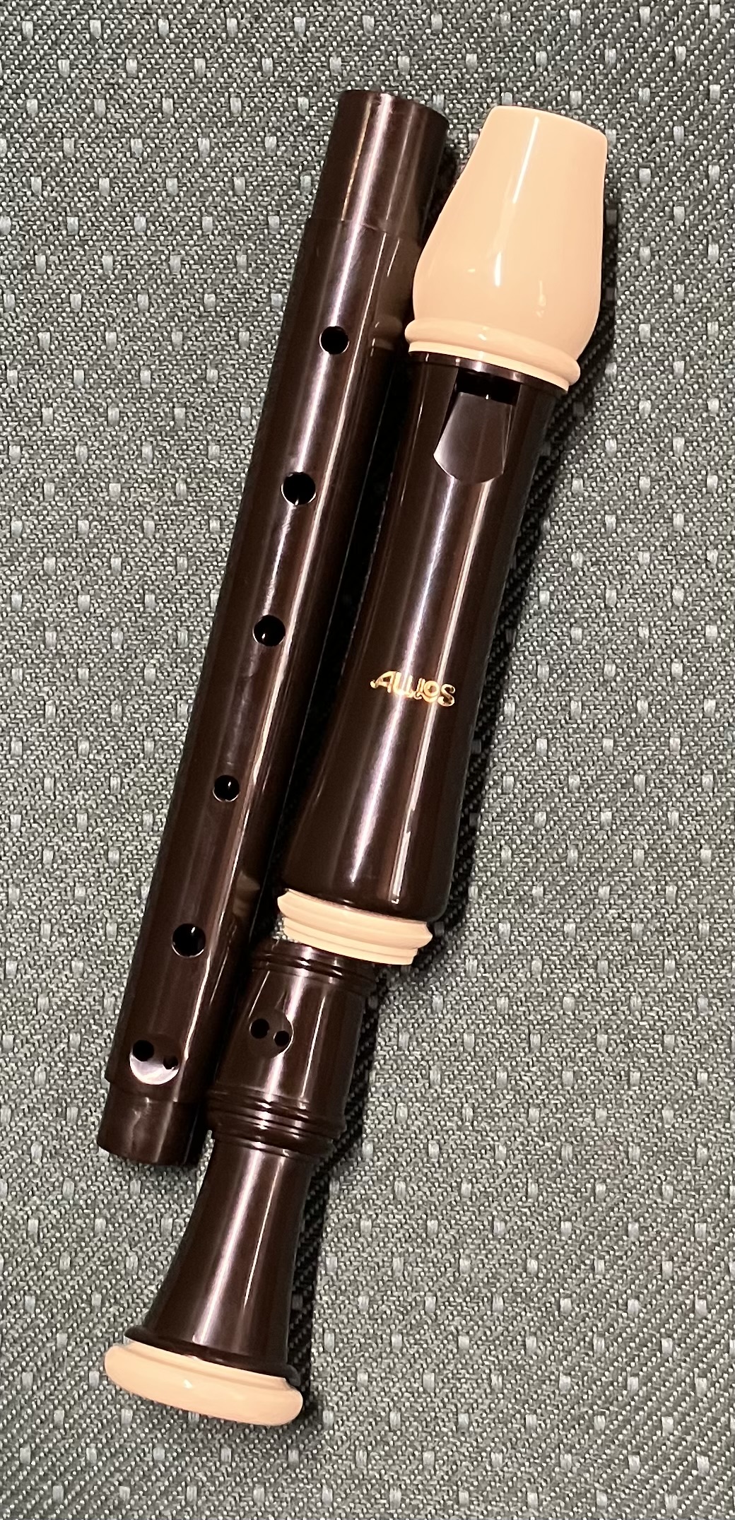 Dark brown plastic with ivory colored beak and trim.Curved windway. Simulated leather bag, cleaning rod, fingering chart.