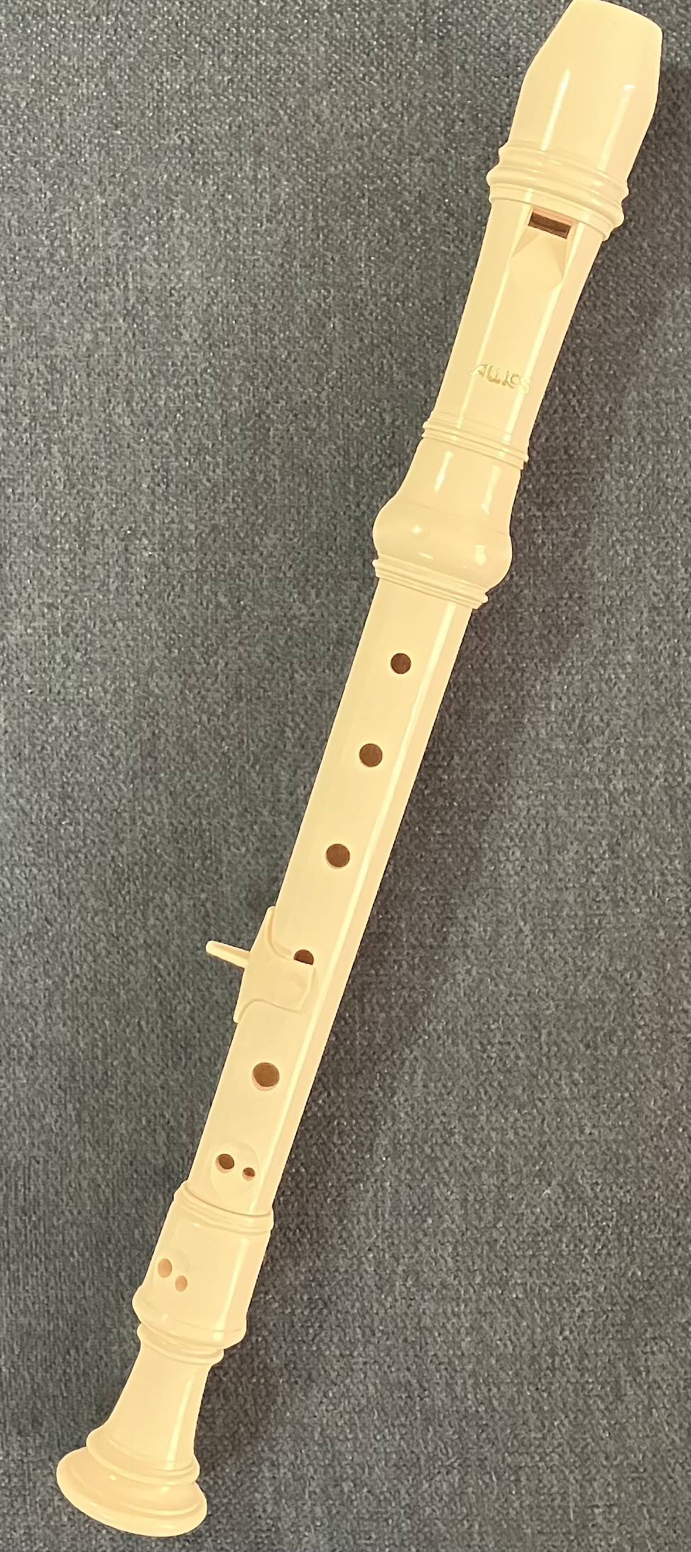 Three piece. Ivory colored. Double holes on low C and D. Straight windway. Detachable thumbrest. Cloth carrying bag, fingering chart, cleaning rod.