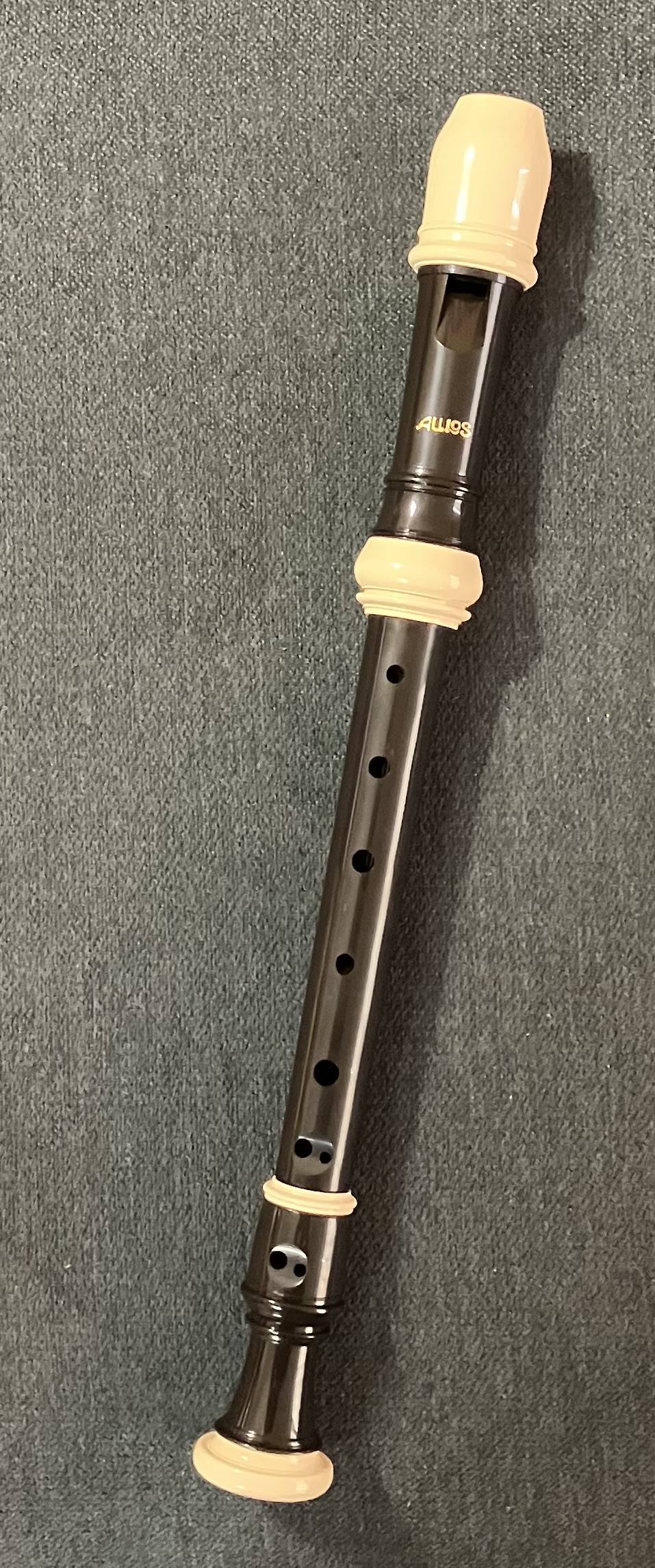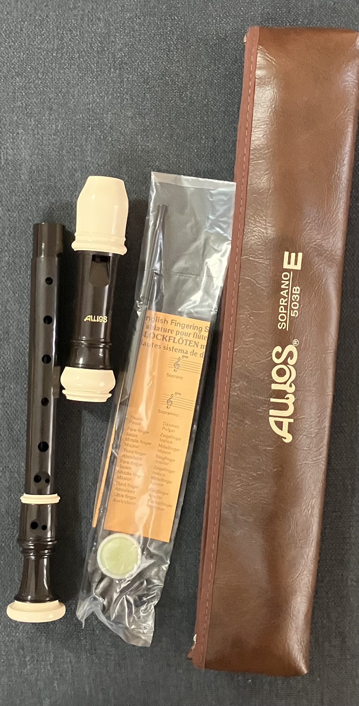Three piece. Curved windway. Very dark brown plastic with ivory colored beak and trim. Cleaning rod, fingering chart, simulated leather bag.