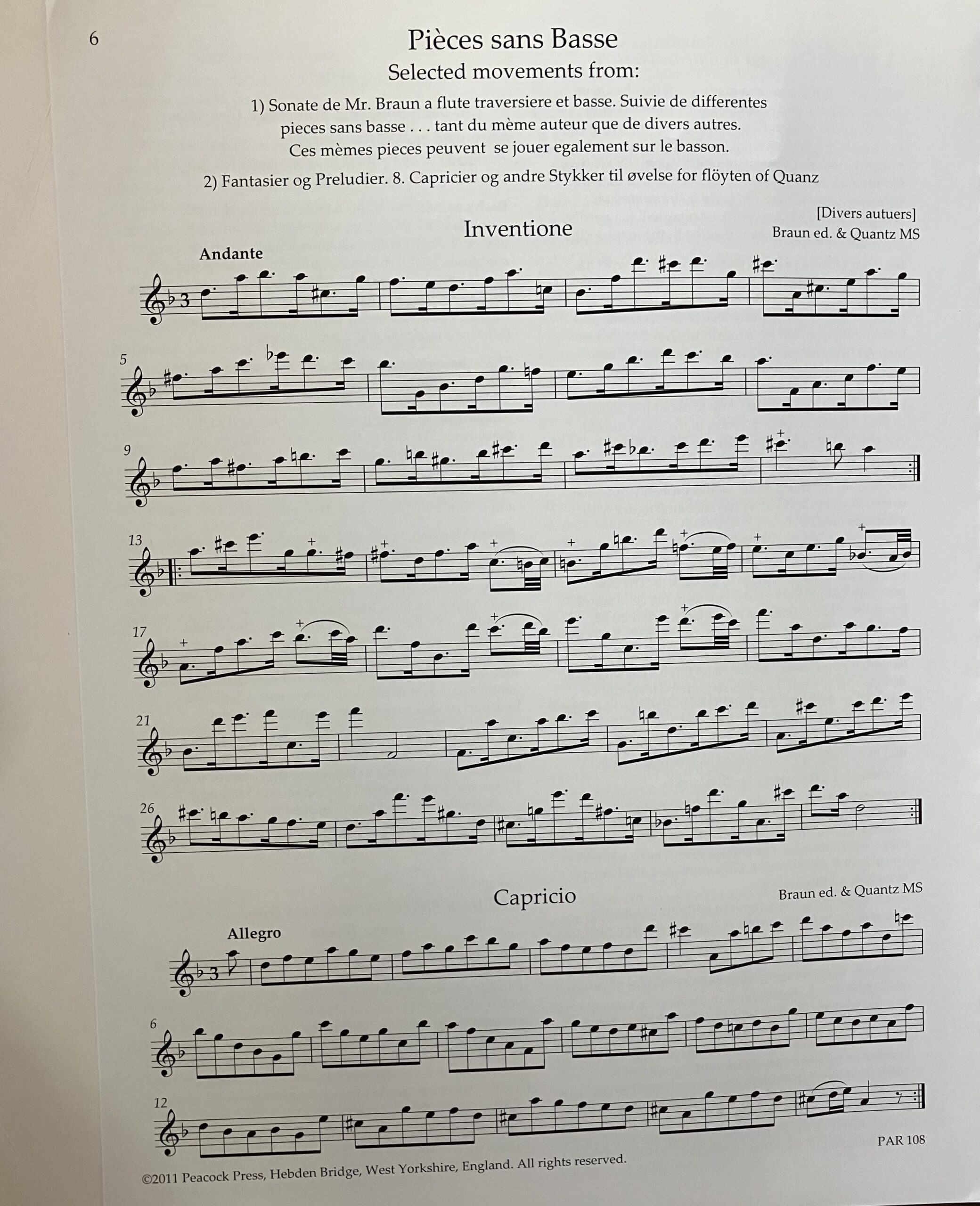 1 A. Telemann Fantasias for flute, Quantz Pieces sans bass; Solo sonatas by J S and C P E Bach. This core repertoire represents the major baroque works for solo flute, transposed for recorder with choices of transposition. Music you come back to again and again.