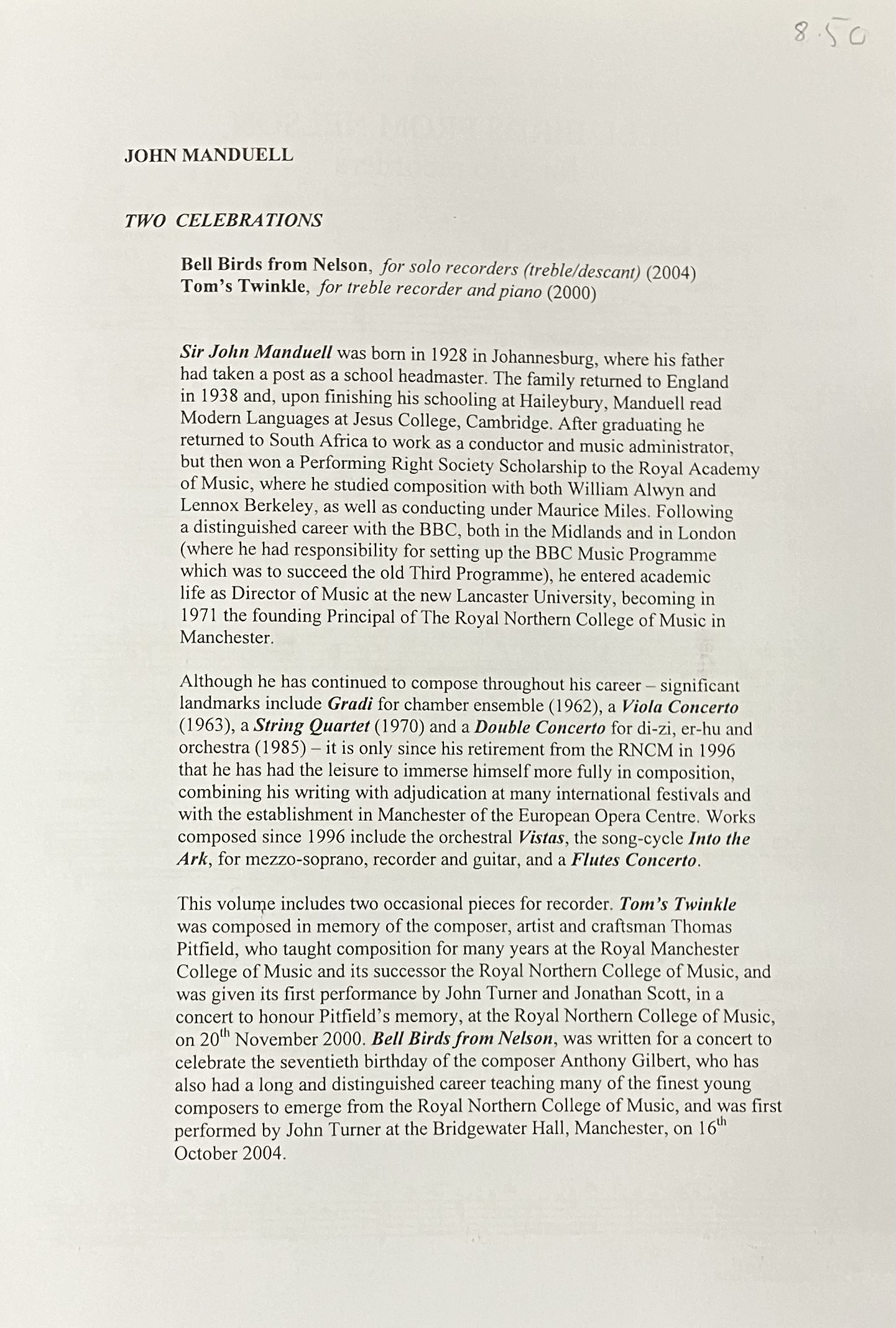 The solo piece, Bell Birds from Nelson for solo treble recorder, is a delightful collage of birdsong.  The second, Tom’s Twinkle, takes as its cue Pitsfield’s own love of unusual rhythms and sparkles, or rather hops, along in 11/8 time.